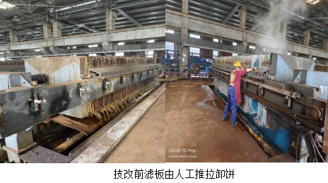 2022年3月威遠(yuǎn)藍(lán)鼎正式接手成渝釩鈦科技欣興釩廠新區(qū)水處理整套水處理系統(tǒng)。運(yùn)行至今,反應(yīng)釜壓濾機(jī)平臺在用的6臺壓濾機(jī)自動卸餅功能全部損壞,每臺壓濾機(jī)87塊濾板,平均每臺卸餅在1.5小時,每班人工依次卸餅一次,最高頻次兩次,人工勞動強(qiáng)度大,工作效率低。高產(chǎn)期間無法滿足濾水要求,同時因為環(huán)境和勞動強(qiáng)度致使員工離職率高。