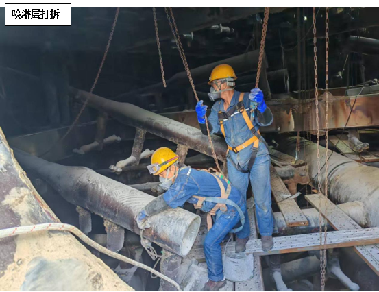 維修方案確定后,攀藍鼎立即開始著手噴淋管道采購預(yù)制工作,考慮到目前燒結(jié)產(chǎn)能不飽和,系統(tǒng)多處停機的因素,決定預(yù)制管道到廠后由檢修進行拆除及更換,只保留技術(shù)性要求較高的玻鋼粘接由專業(yè)施工人員來完成。7月24日,在材料到廠后,檢修立即開始在塔內(nèi)布置安全措施,并進行噴淋層打拆工作,打拆過程中檢修對切下的三通支管進行仔細甄別,磨損嚴(yán)重的進行報廢處理,還具備使用價值的作為備件歸置,以確保物盡其用。打拆完畢后,檢修隨即進行管道吊裝及內(nèi)部組裝配管工作,配管完成后防腐單位開始進場作業(yè),在此過程中檢修全程安排人員進行組對及工程質(zhì)量監(jiān)督工作,并及時撤場收尾。